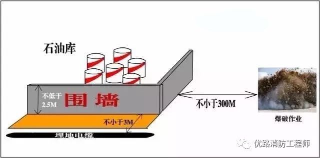 油库的围墙与爆破作业场地(如采石场)的安全距离,不应小于300m。《石油库设计规范》(GB50074-2014)4.0.12