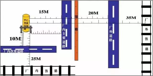 甲、乙类液体储罐与厂外铁路中心线、厂内铁路中心线、厂外道路路边、厂内主要道路路边和厂内次要道路路边的防火间距不应小于35、25、20、15和10米。《建筑设计防火规范》(GB50016-2014)4.2.9