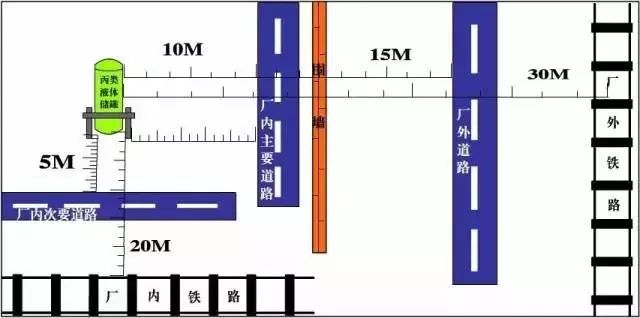 可燃、助燃气体储罐与厂外铁路中心线、厂内铁路中心线、厂外道路路边、厂内主要道路路边和厂内次要道路路边的防火间距不应小于25、20、15、10和5米。《建筑设计防火规范》(GB50016-2014)4.3.6