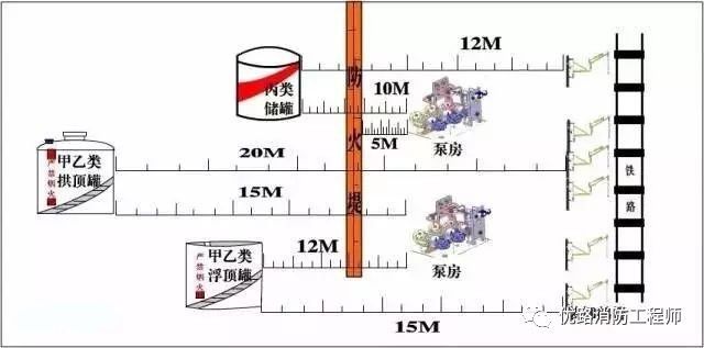 甲乙拱顶罐与其泵房、铁路及装卸鹤管的防火间距为15米和20米;甲乙浮顶罐与其泵房、铁路及装卸鹤管的防火间距为12米和15米;丙类液体储罐与其泵房、铁路及装卸鹤管的防火间距为10米和12米。泵房和装卸鹤管与储罐防火堤外侧基脚线的距离不应小于5米。《建筑设计防火规范》(GB50016-2014)4.2.7