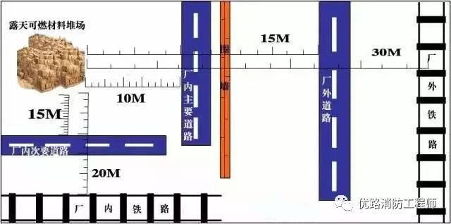 露天、半露天可燃材料堆场与厂外铁路中心线、厂内铁路中心线、厂外道路路边、厂内主要道路路边和厂内次要道路路边的防火间距不应小于30、20、15、10和5米。《建筑设计防火规范》(GB50016-2014)4.5.3