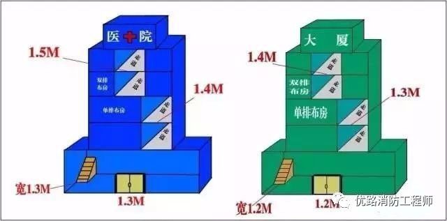 高层医疗建筑楼梯间的首层疏散门和首层疏散外门的宽度为1.3米,单排布房的走道宽1.4米,双排布房的走道宽1.5米,疏散楼梯宽1.3米。其它高层建筑楼梯间的首层疏散门和首层疏散外门的宽度为1.2米,单排布房的走道宽1.3米,双排布房的走道宽1.4米,疏散楼梯宽1.2米。 《建筑设计防火规范》(GB50016-2014)5.5.18