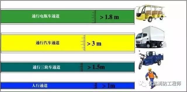 通行汽车,宽度>3 m;通行电瓶车,宽度>1.8 m;通行手推车、三轮车,宽度>1.5 m;一般人行通道,宽度>1 m。(未查到相关标准,但在注安考试教材中有明确说明)