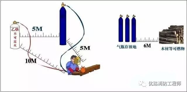 气瓶必须距离实际焊接或切割作业点足够远(一般为5 m 以上),以免接触火花、热渣或火焰,否则必须提供耐火屏障。《焊接与切割安全》(GB9448-1999)10.5.4