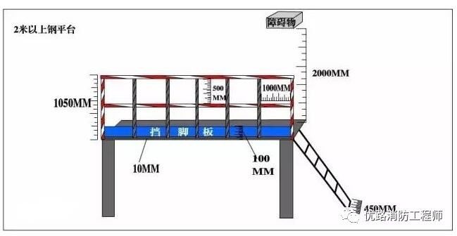 平台地面到上方障碍物的垂直距离不应小于2000MM。《固定式钢梯及平台安全要求第3部分:工业防护栏杆及钢平台》(GB4053.3-2009)6.2.1