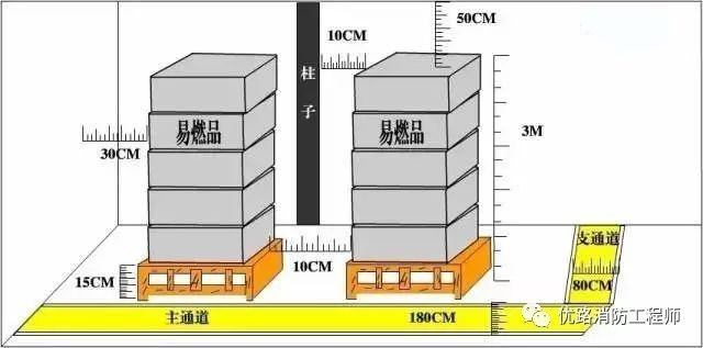 堆垛间距:主通道大于或等于180CM,支通道大于或等于80CM,墙距大于或等于30CM,柱距大于或等于10CM,垛距大于或等于10CM,顶大于或等于50CM。《易燃易爆性商品储存养护技术条件》(GB17914-2013)6.2