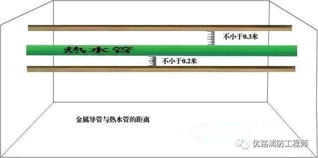 金属导管和金属槽盒敷设时,敷设在热水管下方时,不宜小于 0.2m;在上方时,不宜小于0.3m;《低压配电设计规范》(GB50054-2011)7.2.11