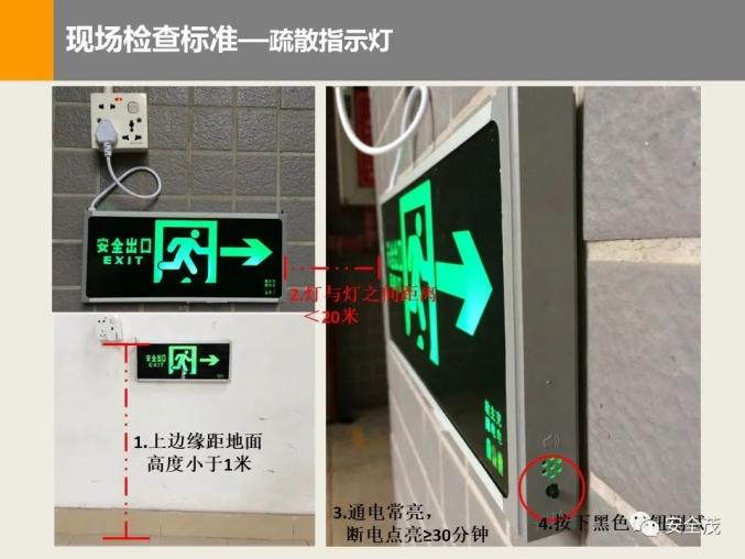 应在疏散走道转弯和交叉部位两侧的墙面、柱面距地面高度1.0m以下设置灯光疏散指示标志;确有困难时,可设置在疏散走道上方2.2m~3.0m处;疏散指示标志的间距不应大于20m。《人员密集场所消防安全管理》(GA654-2006)8.3.4.1