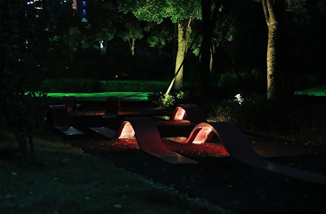 “生态”是商务区的主要特色,五龙湖公园一期、二期、三期、四期都已经完成建设,总面积达到16公顷。配套做了慢行步道、雕塑小品、景观廊架、特色座凳、旱喷戏水等休憩设施,配以夜景灯光,塑造出了形式多样、体验丰富的亲水岸线。