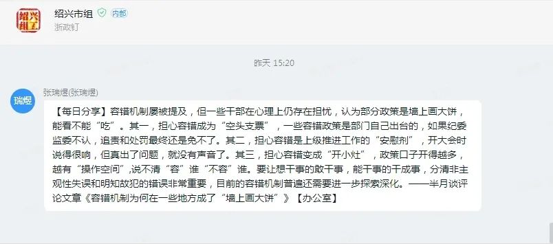 绍兴组工微信号开设“组工锐评”专栏,每周由1名徒弟执笔、1名师傅把关,围绕当前组织工作的热点焦点难点,撰写评论性署名短文。截至目前,共推送锐评文章20篇,其中5篇被《中国组织人事报》或《浙江组工》微信号转载,10篇在省委组织部季度组工宣传通报中被认定为优秀网评文章。