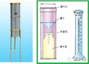 用于测量一段时间内累积降水量的仪器。外壳是金属圆筒分上下两节,上节是一个口径为20厘米的盛水漏斗,为防止雨水溅失,保持器口面积和形状,筒口用坚硬铜质做成内直外斜的刀刃状;下节筒内放一个储水瓶用来收集雨水。测量时,将雨水倒入特制的雨量杯内读取降水量毫米数。