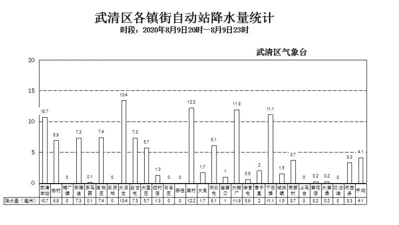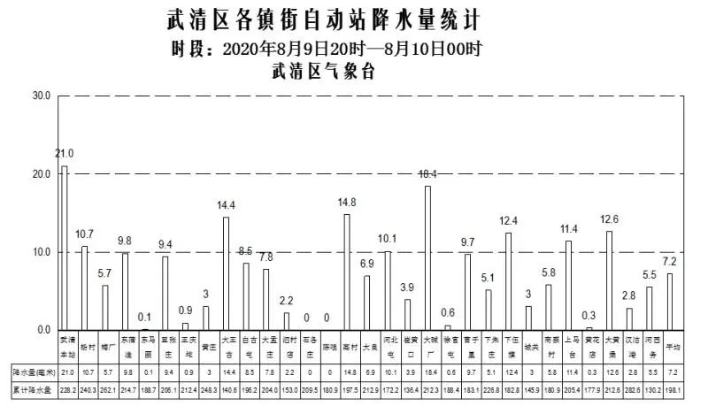 昨天20时前后开始我区出现雷雨天气,雨量分布不均,降雨区平均雨量为17.1毫米,最大雨量28.6毫米出现在王庆坨。其余镇街雨量(mm)如下:杨村17.6,梅厂23、东蒲洼21.1、豆张庄20.7、黄庄22、大王古20、白古屯16.1、大孟庄18、泗村店11.7、高村20.5、大良19.1、河北屯21.5、崔黄口12.7、大碱厂26.2、曹子里20.4、下朱庄21.2、下伍旗22.5、城关10.6、南蔡村15.1、上马台23.3、大黄堡22.7、汊沽港18、河西务17.1,其余地区普遍在10以下。