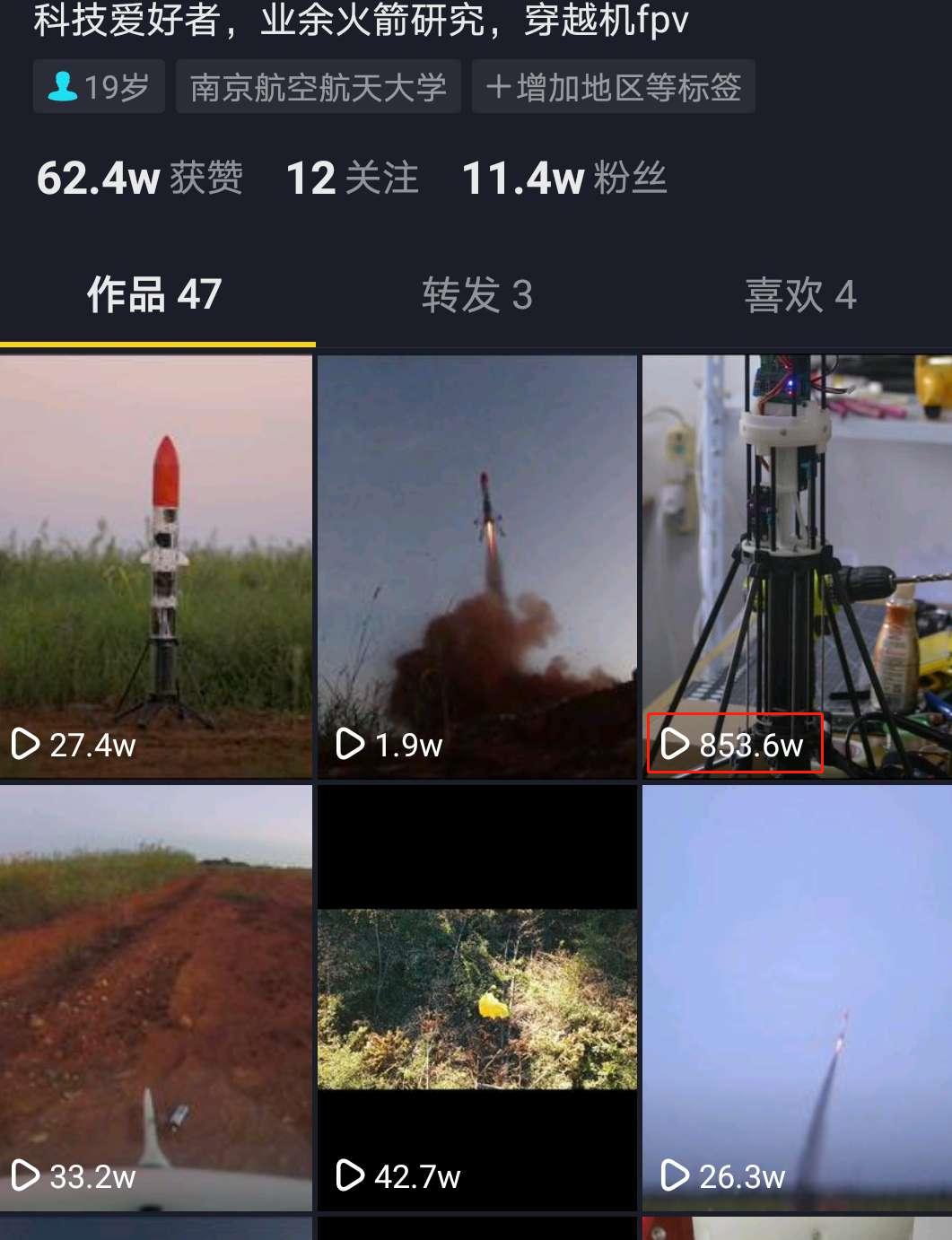 “我就是想搞点好玩炫酷、对社会有价值的东西出来。”在刘上看来,视频的爆红有因可循。“以前大家都觉得只有国外网友能玩火箭,所以在国内看到会觉得还蛮惊喜的。会比较颠覆大众认知,如果我能继续做成功,应该还是挺有鼓舞性的。”