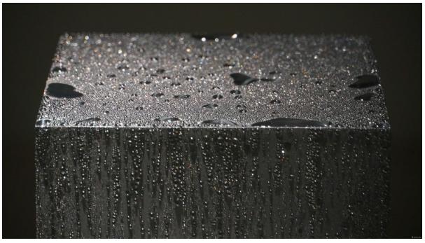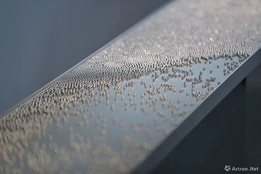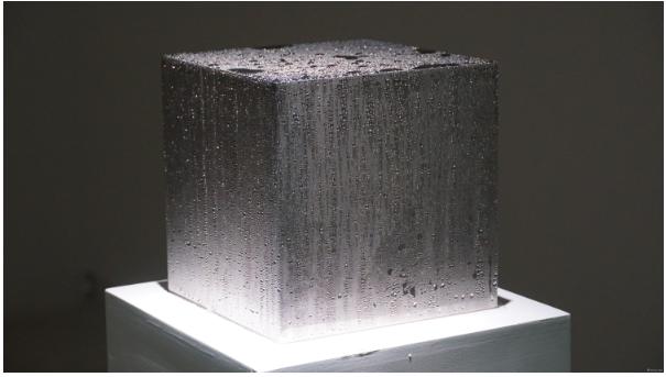 特别是作品《冰方》,一个内装满冷凝胶的不锈钢体立方体。夜间,美术馆会将这个立方体放入冰箱冷藏,白天开展出时再拿出。就是这样简单的动作,作品在展厅里经过时间、温度变化后,看不到的那些气息会凝结成立方体表面上的水珠。而这个水珠就是被我们经常忽视的最简单物理现象。