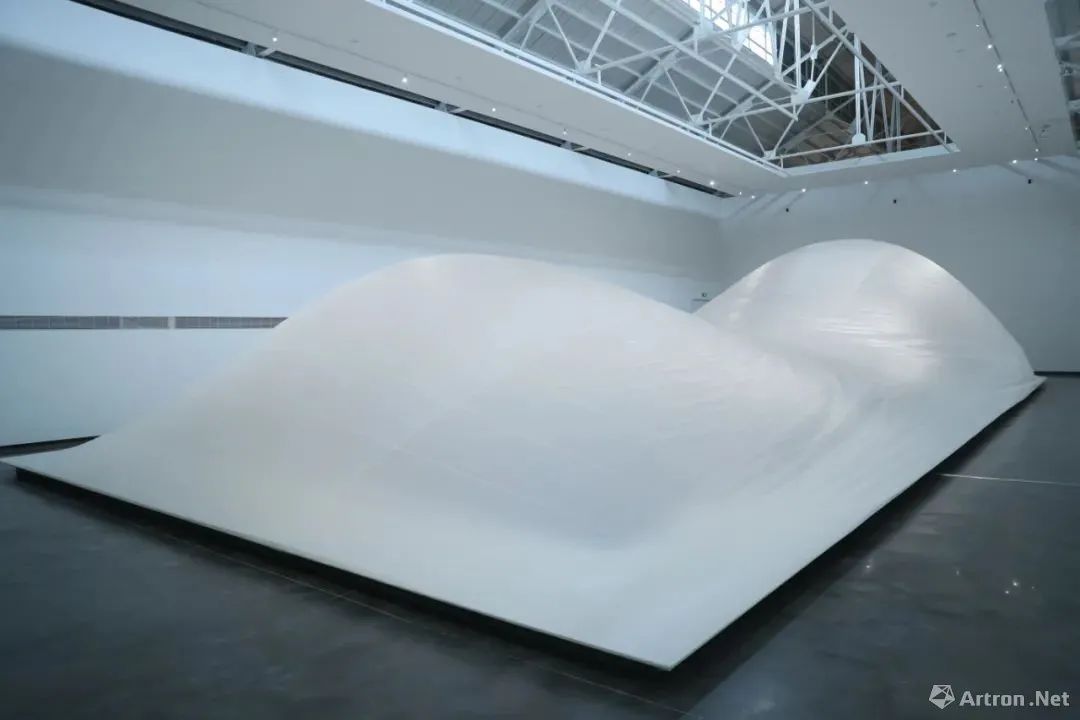 这次为上海民生现代美术馆核心筒独特的层高和结构特点,他们特别创作了场地限定版本的《流动的风景》,整体形象类似一座岛屿。外部材料是芬兰人用于制作船帆的帆布,能漂浮是通过鼓风机让外部空气逐渐填满内部空间。当观众静静去感受这件作品时,风在作品里缓慢流动变化,会发出窸窸窣窣的声音,像在芬兰听雪融化的声音。