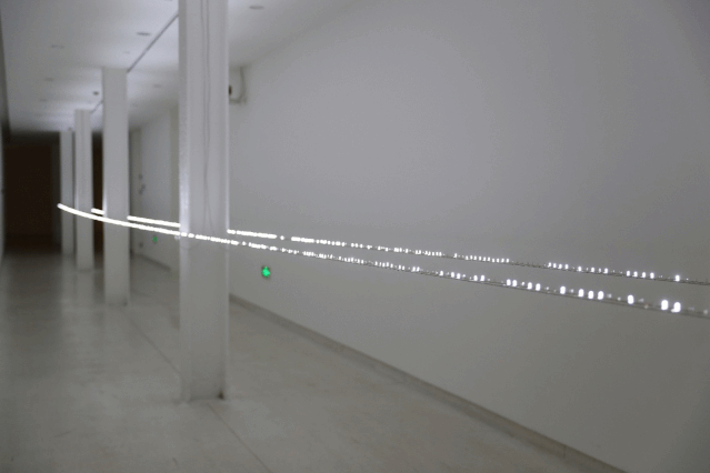 今年布展时,策展团队接到了他们邮件过来的安装呈现技术图纸,专业到图纸里面的所有不锈钢配件都需单独定制。最终呈现效果是各有800枚白色灯珠的两条24米 LED 灯带,悬挂在柱子中间,表面上,这些 LED 灯之间并无区别,但是它们每一个闪烁的频率都不一样,很容易让人想到芬兰黑夜和白昼交替的时刻。