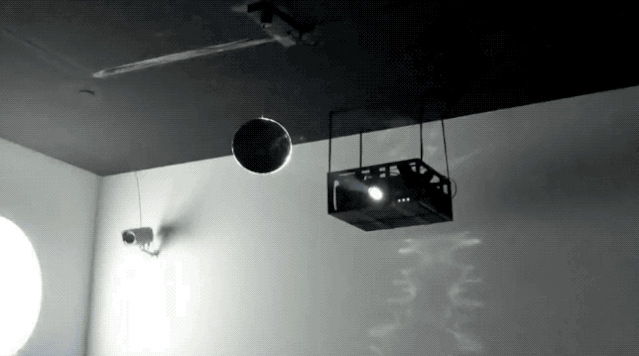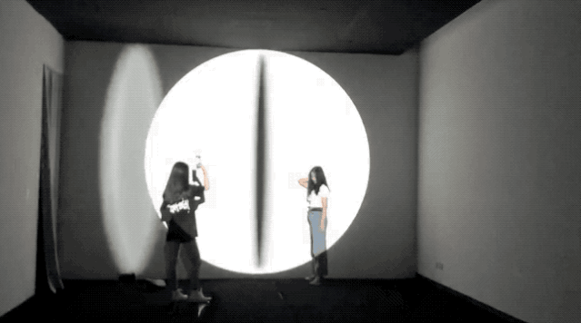 《月食》以光学原理模拟了月食的过程,而两位艺术家的操作也很简单,将一束光照射向一面镜子,通过镜子缓慢转动,会形成一个图形在对面墙壁上,而图形不断变化的形态就类似月食的运行。另外现场还有一束圆形光斑快速移动,整体空间像月亮围着太阳在转。而当镜子转到一个角度的时候,墙面投影又很像眼睛,看着观众。