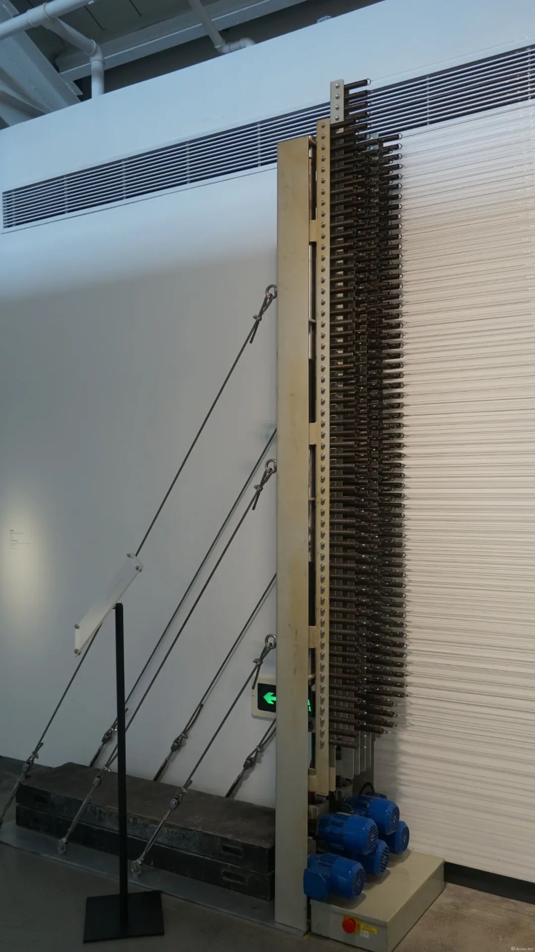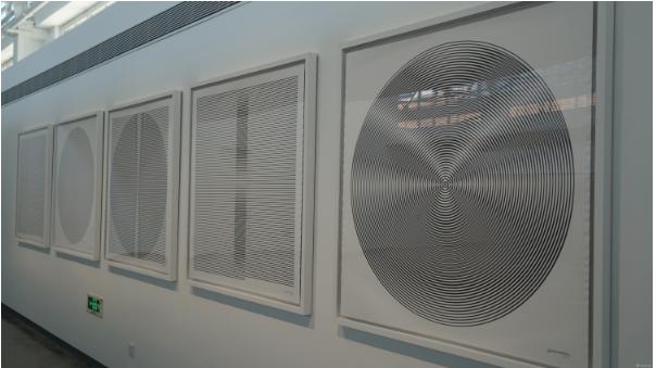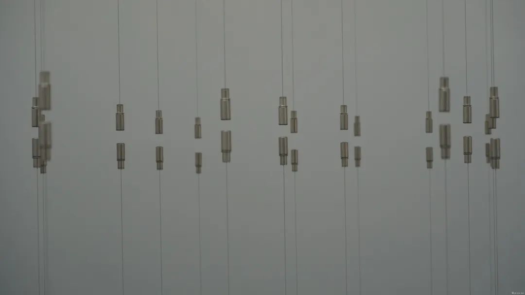 2001年创作的《钢丝装置》,与《线条与圆》相反,是以动态的环境产生一种二维平面静态的感觉。钢框架各占一端,用5层钢丝线叠加呈现,数百根钢丝在移动导轨之间拉伸,形成五个独立移动的层。不同层之间交错着上下缓慢移动,在墙面反衬下形成不断变化的动态图形,探讨了在动力装置中的显像方式。