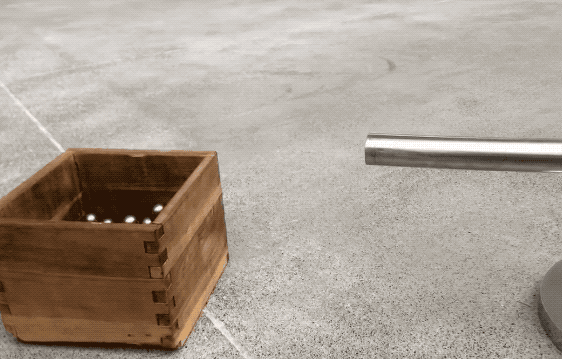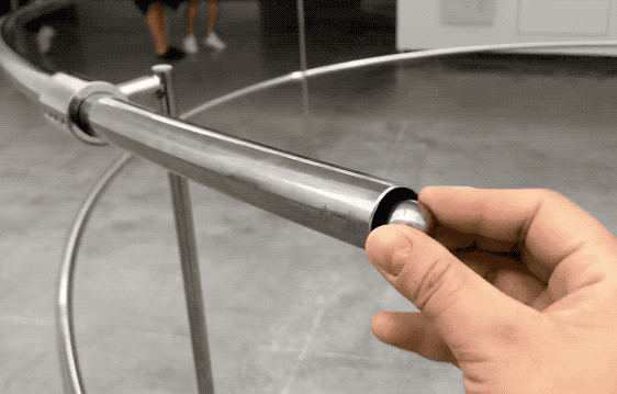 《气旋》是一件邀请观众互动的作品,你可以拿起一颗钢球放入螺旋的钢管中,钢珠会经过长长的螺旋轨道,最后落入小方盒子。在整个钢球运行的过程中,我们可以听到钢球和管道摩擦产生的声音。在重力之下,运动的钢球最后会准确无误的掉进制定的小盒子内。