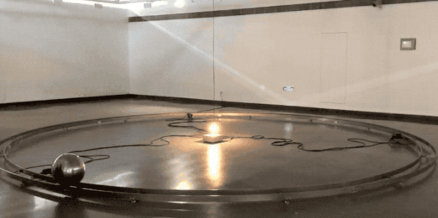 在现场还有一件永远运行中的作品《轨道》,是汤米·格伦德和佩特里·尼苏南依旧用钢球、不锈钢、电线搭建出的简单装置,但可以把这件作品理解为一个球体在宇宙中运行。当圆形轨道上的球体经过闸口的时候,会碰到弹簧,之后轨道会逐渐地收缩,将球体向前挤压,在一挤一放的过程中钢球就像是永动机一样不停地运动。