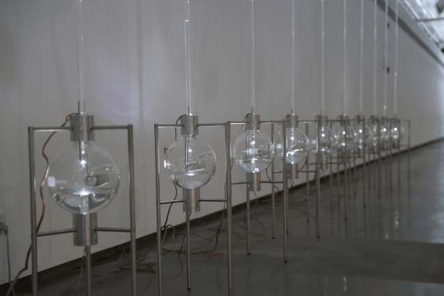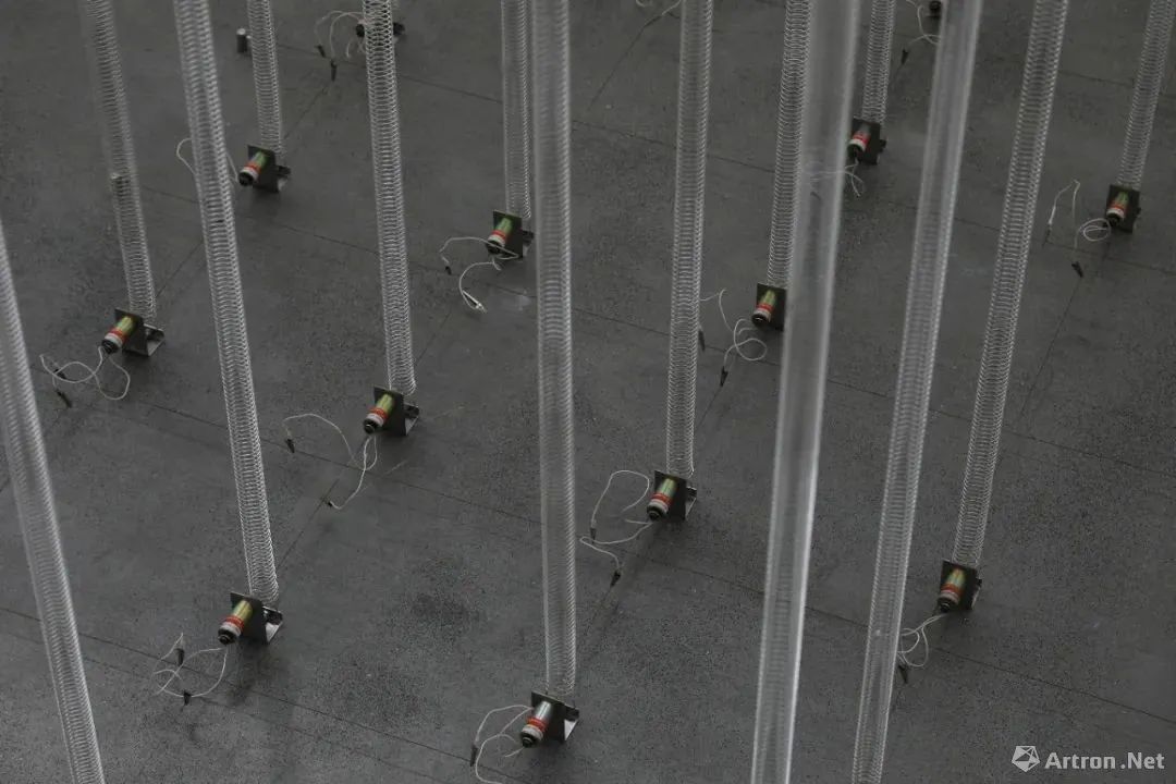 动态装置《液压示图》采用了温度计的原理,当温度上升,球体内部的气压压迫水位上升,形成水柱高低起伏的状态。在策展人马楠看来,这件作品会让我们联想到全球气候变暖的问题,海平面因为温度的升高而上升。气候变暖对于很多人来说是个抽象的概念,而艺术家通过这样一种隐晦的方式,将它具象化,提醒着我们留心观察日常行为所产生的后果。