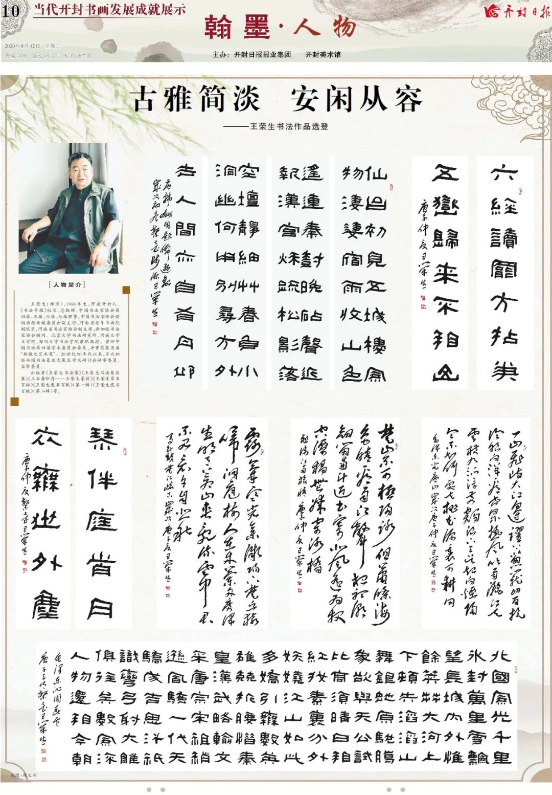 老报人王荣生,在书法圈名声很大,盖因他所创办的在全国颇有影响的《书法导报》,凡热爱书法的人,或多或少都与它有过交集。每周洋洋洒洒二三十个版面与读者见面,内容丰富,信息量大,品质高,具有大家风范。当代书法界知名人士、实力派书法家,或正在步入书坛的习作者,哪个没上过《书法导报》?《书法导报》在全国推出了一茬又一茬的新生代,作为社长、总编辑的荣生,为书法园地辛勤耕耘,精心浇灌,心血培育,换来岁岁繁茂葱郁之景象,功莫大焉,令人起敬。