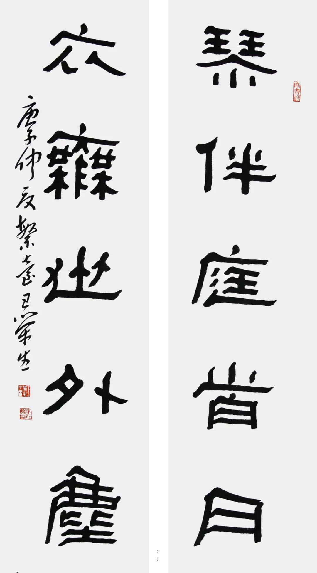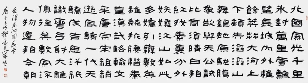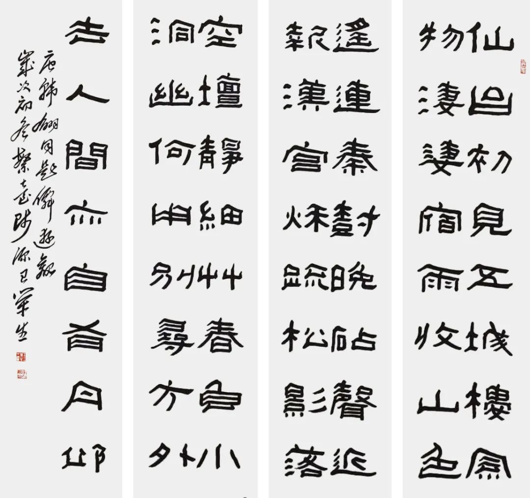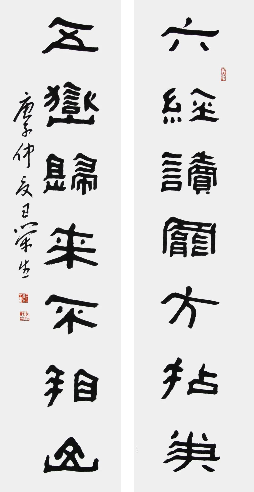 荣生学书甚早,始于20世纪70年代初期,在汴上前辈书家的指导下,打下了坚实的基础。他融会碑帖,五体皆能,除了人们常见的行草书外,尤擅隶书。他的隶书以汉碑为基,于《张迁碑》《石门颂》浑厚恣肆一路用功尤深,于清人则倾心郑谷口、金冬心、何绍基,上下求索,取百家之长,熔铸个人面目。他的隶书用笔厚重,入木三分,点画涩,笔力强;结字平正开张,流露出重、拙、大的气象。近年展赛的隶书,花哨有余,擦脂抹粉,已被称为“俗隶”,根本原因是背离了汉碑雍容大气的精神,“展览体”的痼疾令人生厌。相信随着时间的推移,隶书创作一定会回归汉风,而荣生的隶书,也将会更显其独到的价值。