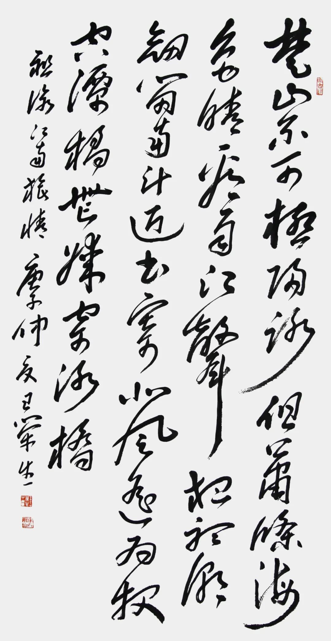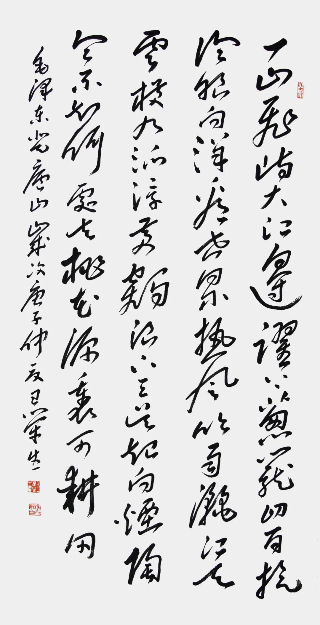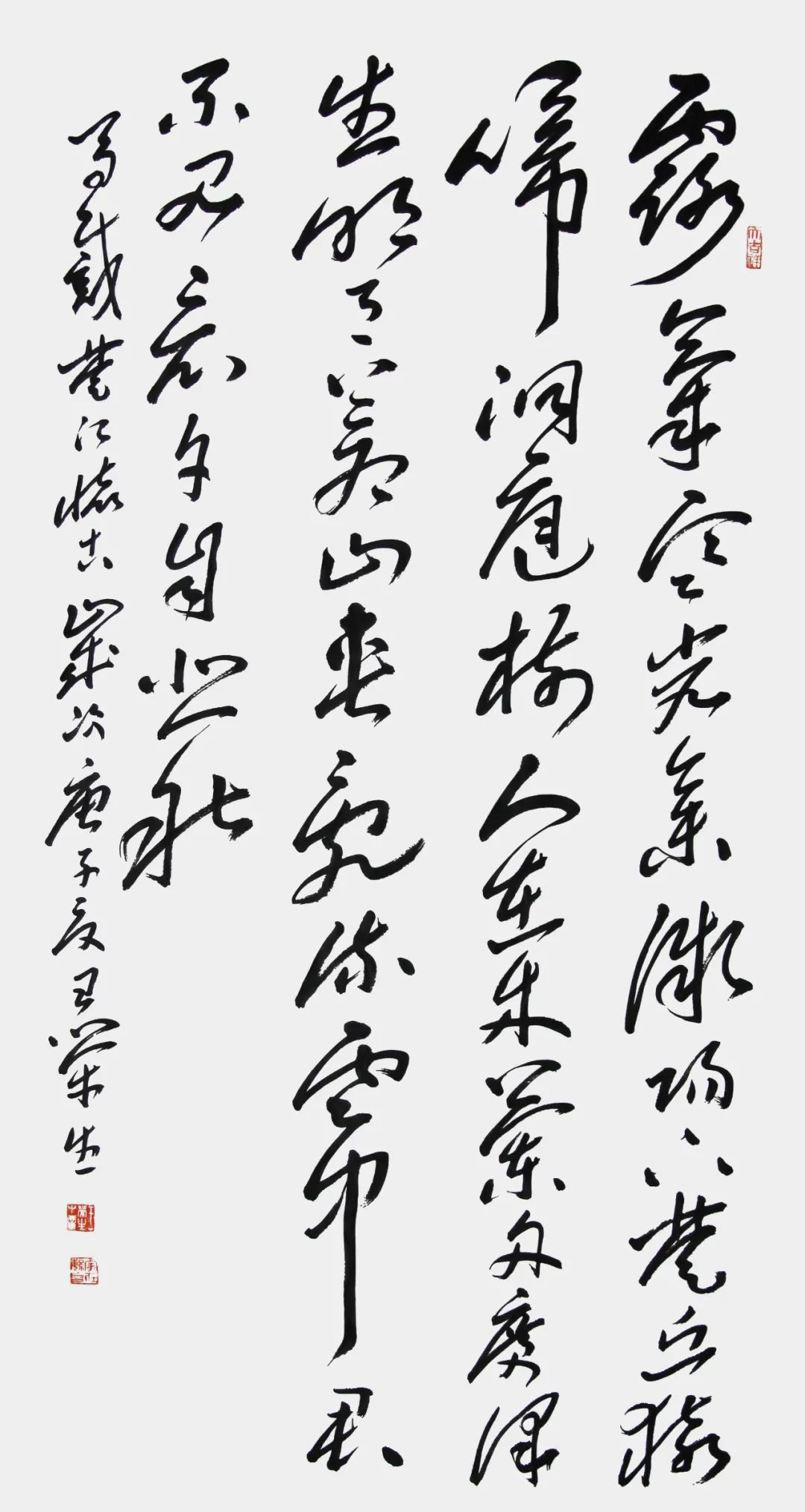 东汉蔡邕认为书法应是襟怀的流露,“书者散也。欲书先散怀抱,任情恣性,然后书之”。荣生的书法,独具审美个性,从中可见他的“这一个”,最近他赠我的李端的诗“抱琴看鹤去,枕石待云归”通篇自然入性,洒落成趣,极富消散淡雅之气,流露出个人的风神气息,书法形式与诗歌内蕴的禅意相互映照,使艺术顿开新境,启发提升了读者对诗歌意境的理解,对其书法艺术的叹赏。