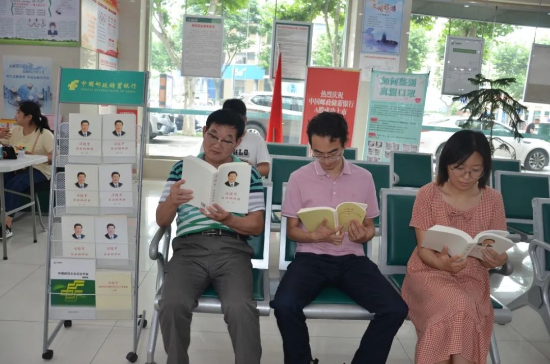 7月22日,江苏省东台市东亭路邮政支局客户在等待办理业务时阅读《习近平谈治国理政》第三卷和《习近平新时代中国特色社会主义思想三十讲》。