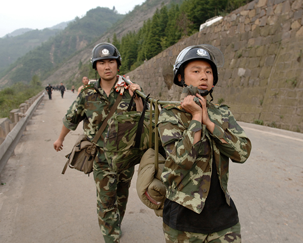 陈陆他咬牙坚持,拖着伤腿,背着60 余斤重的破拆设备,连续10天在震区搜寻生命。