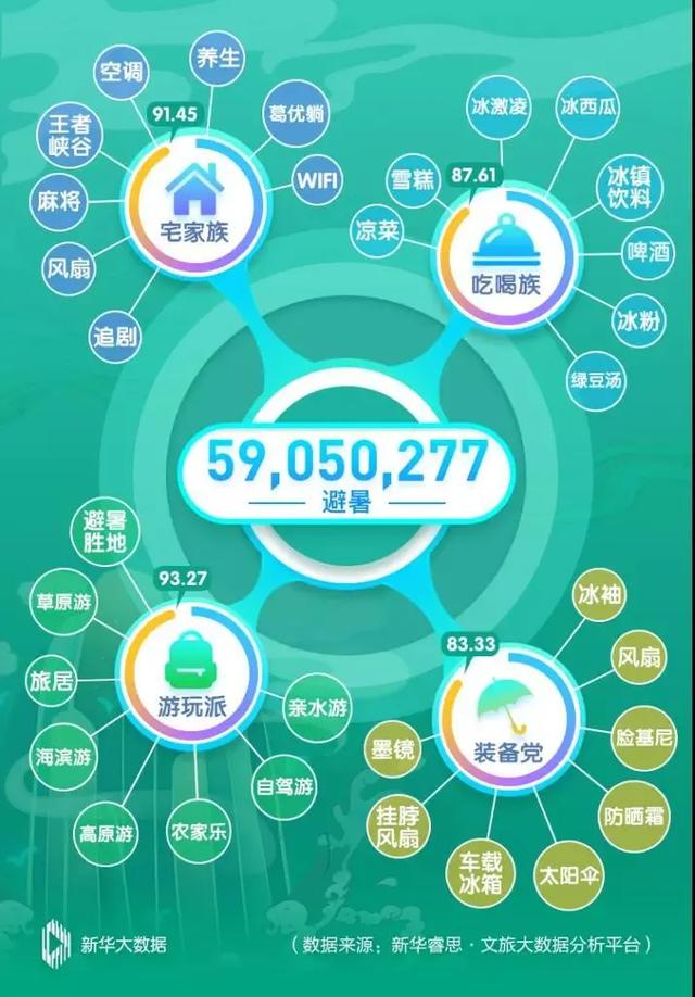 根据大数据分析显示,坚决“足不出户”的“宅家族”、借助夏日特饮和美食来抵御酷暑的“吃喝族”、哪儿凉快就去哪呆着的“游玩派”……花式避暑,这届网民是非常认真的。其中,“游玩派”的话题热度最高,“避暑游”成为网民向往的避暑消夏方式之一。