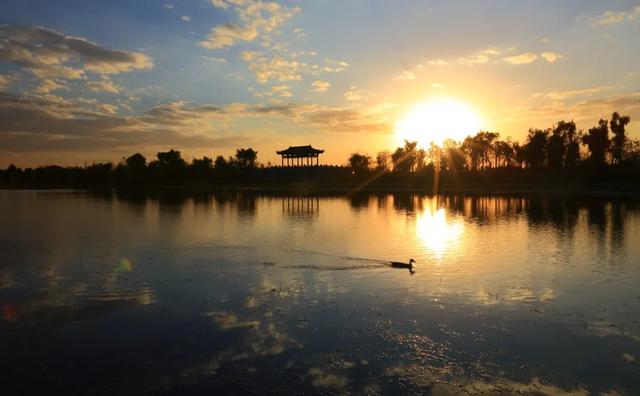 灿烂的晚霞与波光粼粼的湖面、嫩绿的杨柳交相辉映,宛如人间仙境。