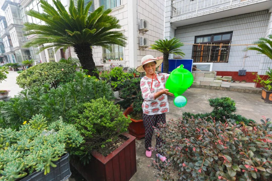 比如沈妹华家,盆景苗木的培育费、看护费,加上场地补贴,一年能够增加8000多元的净收入。“如果自己养护的盆景再卖出去,沈妹华家还能再拿利润的30%。”周云安说,目前这样的庭院经济试点了10户,农户的参与度很高,“参与试点的基本都是65岁以上老人,对花卉也较感兴趣。我们向农户提供肥料、农药,他们只需要负责日常养护。”沈妹华指着庭院里的花草笑着说:“我每天给它们浇浇水、除除草,心情也舒畅了许多。”