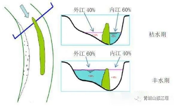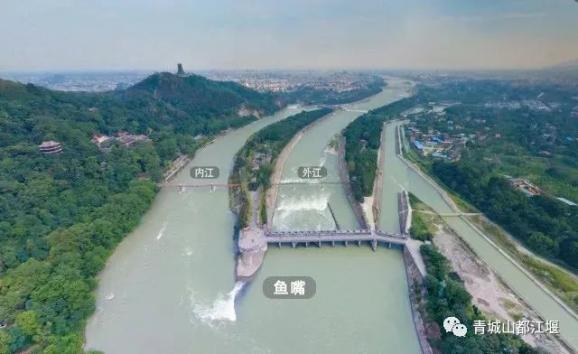 第一道工程是鱼嘴工程,它修建在岷江的弯道处,汹涌的水流到了这里会被这道“分水堤”分为内江和外江,外江排洪,内江通过宝瓶口流入成都平原。