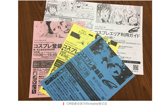 全球最大规模同人展COMIKET由于人流巨大,对COSPLAY采取的是登记准入制。在COMIKET,COSPLAY活动作为ACG文化同好交流的一种形式保留下来,但同时CM组委会也强调,“希望各位能怀着责任去COSPLAY,不要放弃思考与学习。作为表现者,在享受自主表现时不能忘记自己的责任,要知道自己在做什么,需要考虑接受方的感情与社会全体。 ”