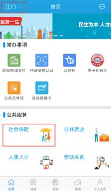 第二步:打开【广东人社】APP,完成注册并登录。进入【首页】,选择城市【江门】,点击【公共服务】的【社会保险】。
