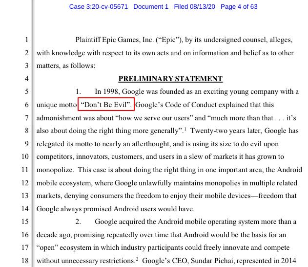 Epic 对谷歌态度虽然没有对苹果那么冲,但也是嘲讽意味十足,直接阴阳怪气谷歌的座右铭 “ 不作恶 ” 。