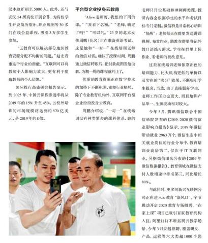 今年5月,腾讯微信联合中国信通院发布的《2019-2020微信就业影响力报告》显示,2019年微信带动就业2963万个,微信生态中相关就业岗位的行业分布中,教育培训业高居第二,仅次于IT互联网业。