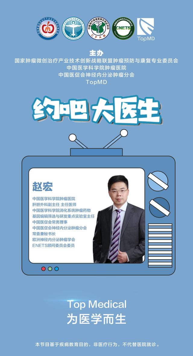 2020年7月23日中国医学科学院肿瘤医院胰胃外科副主任、主任医师赵东兵教授,中国医学科学院肿瘤医院内科主任医师依荷芭丽•迟教授,中国医学科学院肿瘤医院肝胆外科副主任、主任医师赵宏教授做客TopMD患教栏目《约吧大医生》的直播间,三位教授从各自的角度为我们科普了神经内分泌肿瘤。