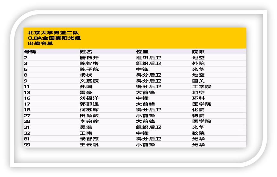北京大学男篮二队是一支历史悠久的球队,这支由非特长生的普通北大同学组成的队伍在体育教研部的关怀指导和男篮一队的鼎力支持下,认真训练、拼搏进取。本届比赛中,他们能拿下全国赛亚军,是每一位队员在赛场上奋力拼搏的结果。