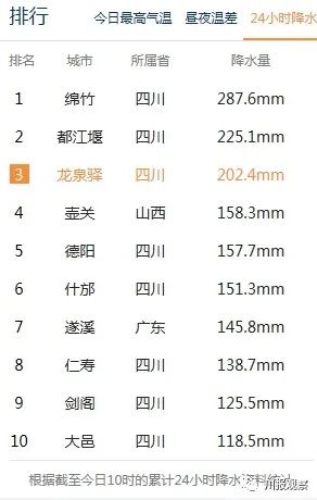 截至8月16日10时,全国降水排行榜上,四川绵竹、都江堰、龙泉驿、德阳、什邡、仁寿、剑阁、大邑8个国家气象站点凭借累计24小时降水量进入前十名。