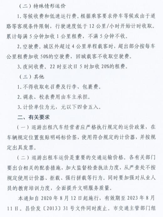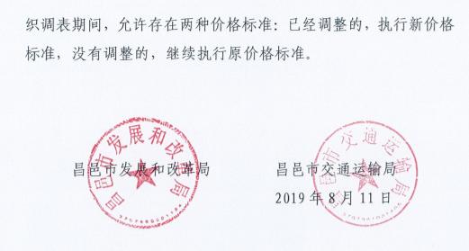调整后的价格标准自2020年8月12日起施行,有效期3年。市交通主管部门组织调表期间,允许存在两种价格标准:已经调整的,执行新价格标准;没有调整的,继续执行原价格标准。