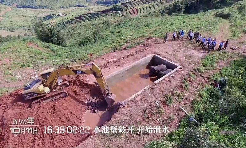 眼看象宝宝即将溺水,西双版纳州职能部门紧急派出直升机、挖掘机、无人机赶赴现场,专家、森林公安、武警、村民协力,在驱赶象群保障现场人员安全的前提下,用挖掘机将钢筋水泥浇灌的水池破开一个3米深的口子,成功救出被困55小时的3头野象。