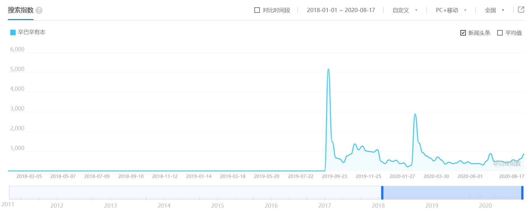 百度搜索指数显示,继去年8月的婚礼之后,今年1月,“辛巴辛有志”迎来第二个搜索高峰,这次用到的第二招是:做慈善。
