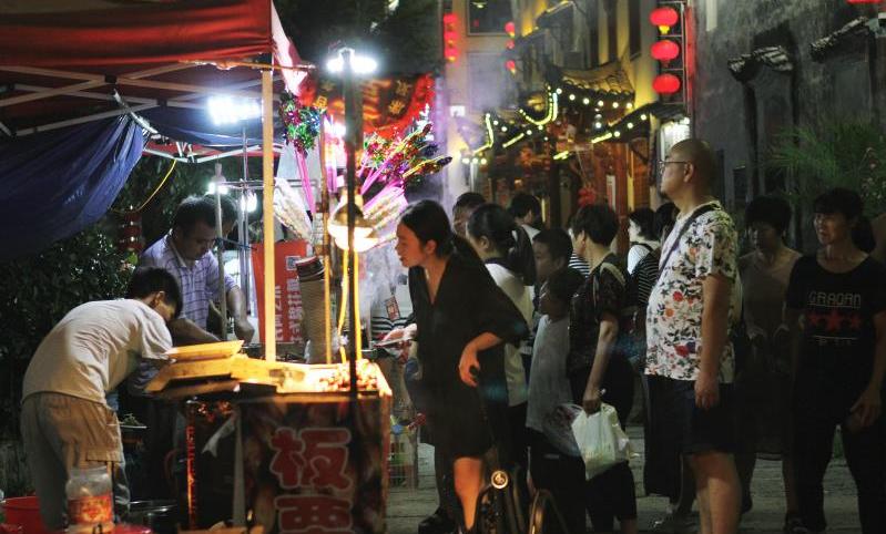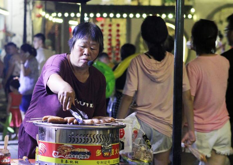 在背街小巷,游客们“邂逅”李白、杜甫的诗歌,浪漫气息扑面而来。络绎不绝的人群也为村民带来了商机,整齐划一的摊位,琳琅满目的小吃,除了具有本地特色木莲豆腐、柴籽豆腐外,烤肉串、臭豆腐,可以说是应有尽有,几米开外就能闻味而至,让人欲罢不能。摊主郑晓红在上河经营着蒸米粉发糕和红糖馒头的生意,说起最近这段时间晚上的生意,她非常高兴,随着上河在外的名气越来越大,外地的游客也与日俱增,对于刚刚出炉的发糕馒头,过往的客人都会带点回家。“最近生意很好,红糖馒头和发糕我每天都能卖一两百个。”