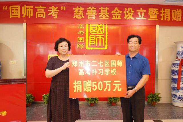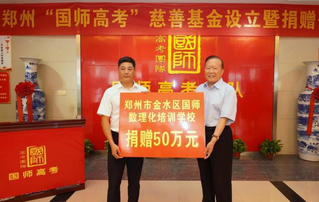 8月18日下午,郑州国师高考团队向郑州慈善总会捐赠100万元成立慈善基金,助力困难学生实现大学梦。捐赠仪式在郑州市金水区国师数理化培训学校举行,郑州慈善总会会长姚待献、副会长王合生出席了本次活动。
