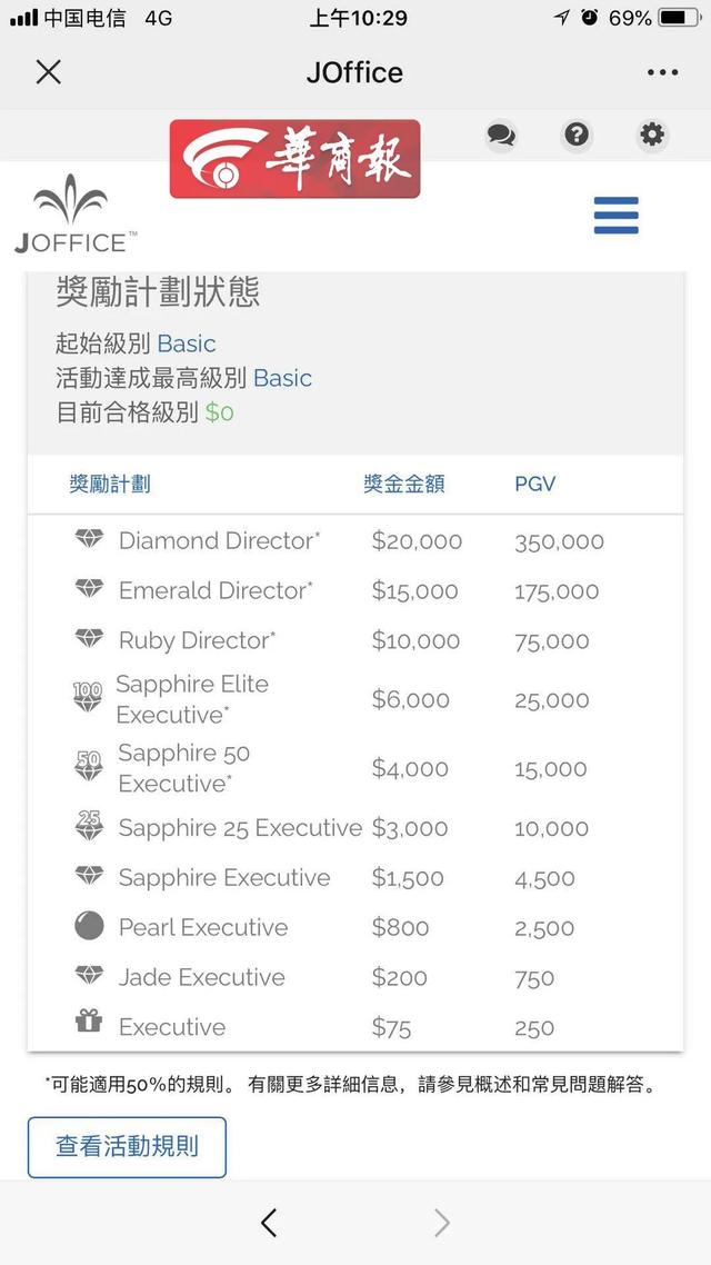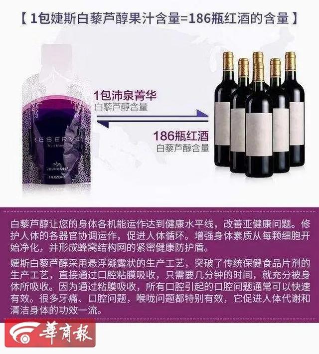 8月18日,华商报记者看到婕斯的广告宣传页上称,一包婕斯白藜芦醇果汁含量等于168瓶红酒的含量,并有抗衰老等功能,婕斯会员登录网站上显示,奖励计划中分了10个等级,奖励金额从75美金到20000美金不等。而小杨父母平时食用的婕斯产品外包装上,并无任何中文字样。