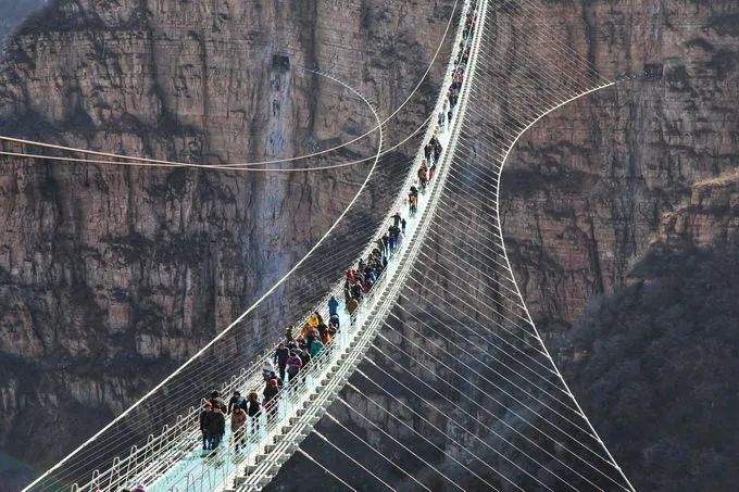 河北石家庄红崖谷景区主打“世界最长、跨径最大的悬空式玻璃吊桥”的概念,2017年12月投入运营,这也为此吸引了大批的游客。