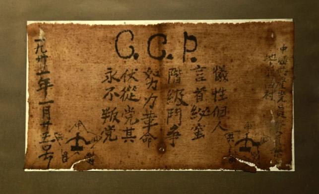 蜜(严守秘密),阶级斗争,努力革命,伏(服)从党其(纪),永不叛党。”这是此次展览中一份引人注目的入党誓词,也是中国共产党现存的最为独特的入党誓词。它出自于江西省永新县北田村贺页朵之手,誓言再现了这位农民党员坚定的革命信念。