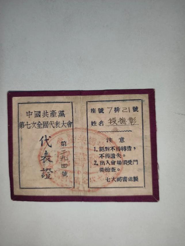 段德彰参加党的七大的代表证